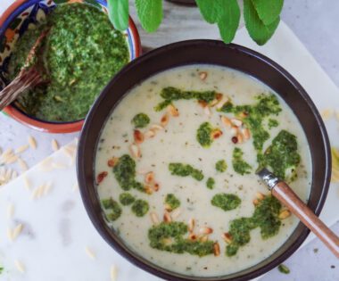 Creamy White Bean Orzo Soup with Kale Pesto