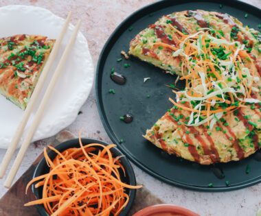 Okonomiyaki Pancakes with Gochujang Peanut Dipping Sauce