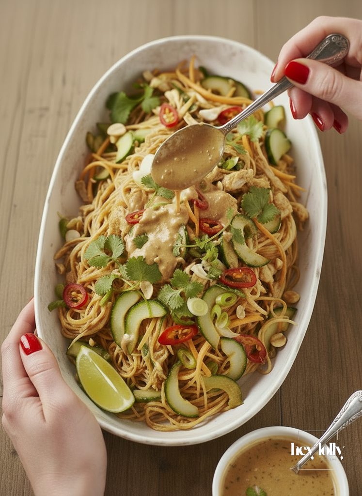 The dressing is where the “bang bang” part earns its keep. Peanut butter for body, lime for brightness, soy for savoury depth, and sriracha for warmth. It should be creamy and clingy, not thick like plaster. So, loosen it with a spoonful or two of hot water until it behaves willingly.