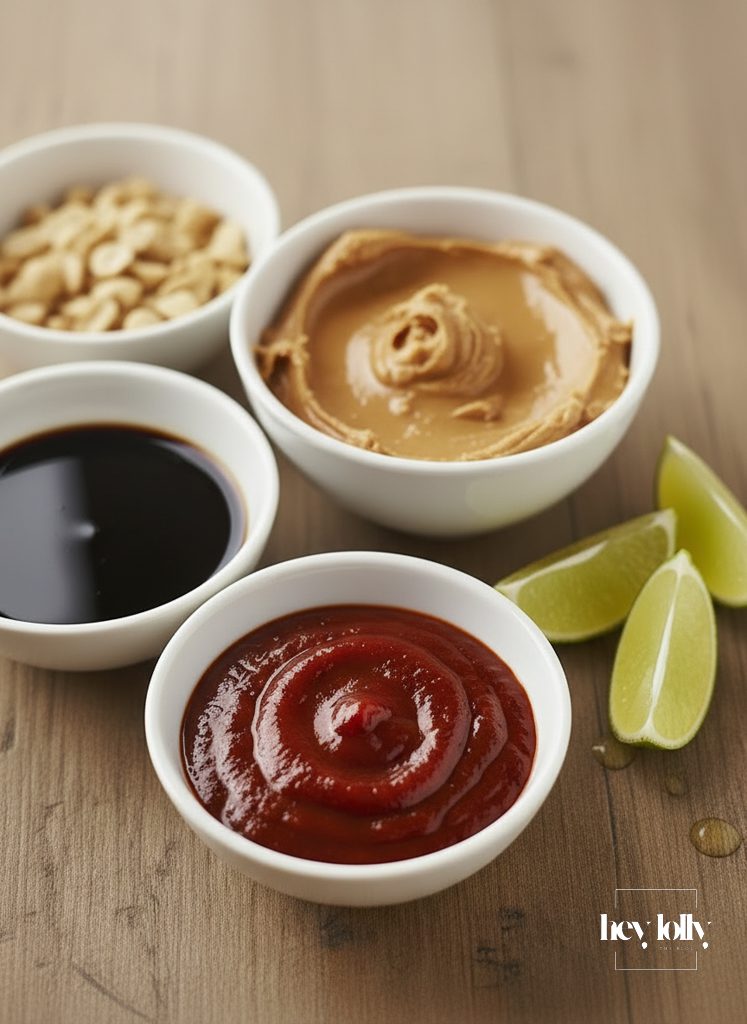 - In a bowl, whisk together peanut butter, soy sauce, sriracha, sesame oil, lime zest and juice, and vinegar.