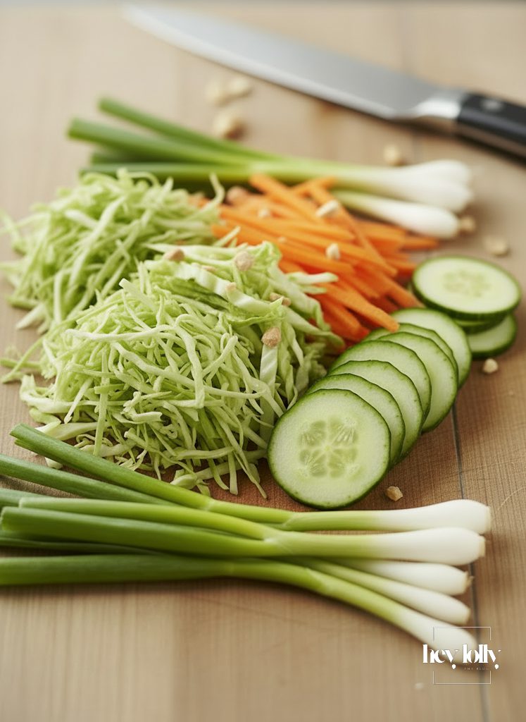 - Add turkey, cucumber, carrots, red cabbage, and spring onions.