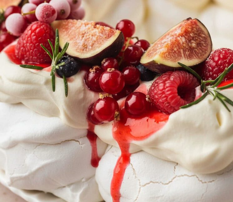 Now, the detail that makes this berry wreath pavlova feel intentional rather than simply “topped”: a quick frozen redcurrant drizzle. It’s sharp and glossy and just tart enough to cut through the cream. More importantly, it gives you that festive finish, the kind of crimson streaks you’d swear were planned, rather than the happy result of warming berries in a pan while pretending you’re not watching the roast potatoes.