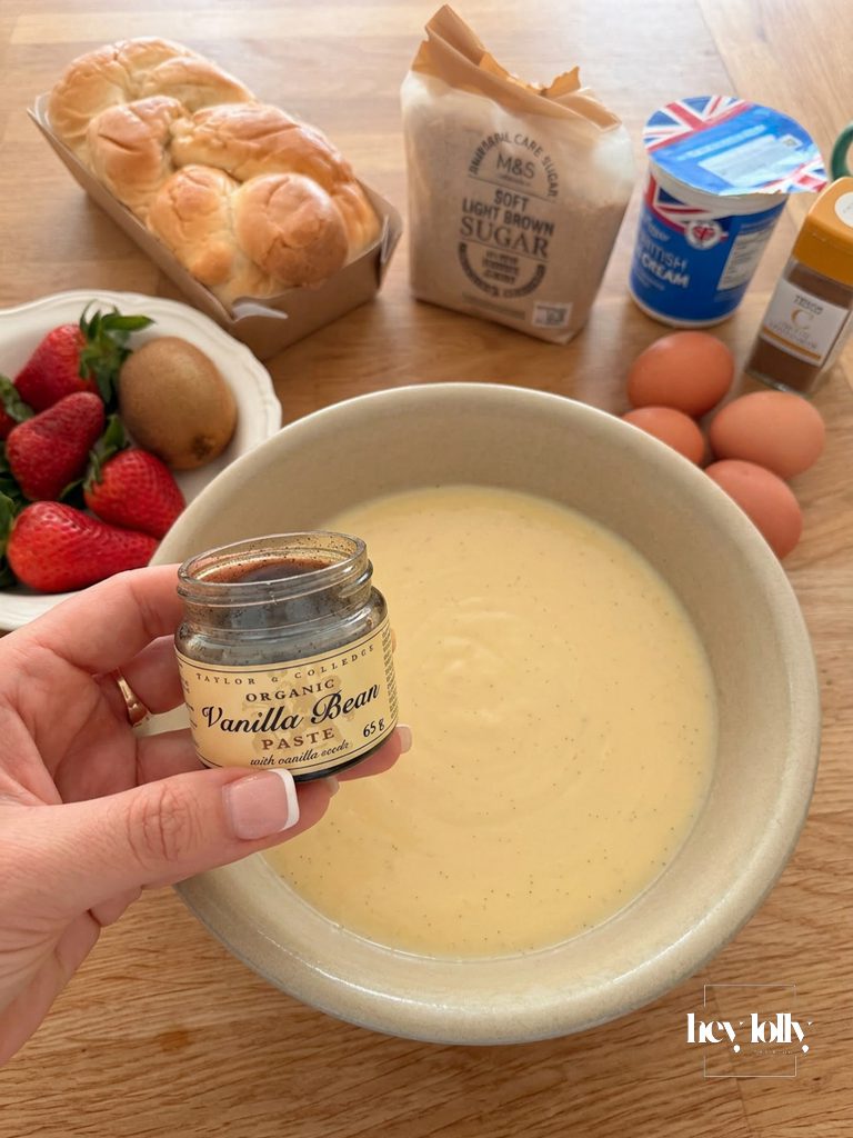• In a shallow bowl, whisk together the eggs, milk, vanilla extract, caster sugar and a small pinch of salt until smooth.