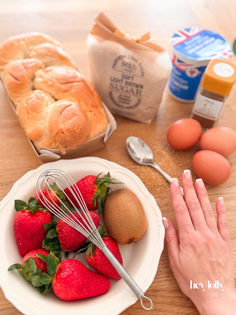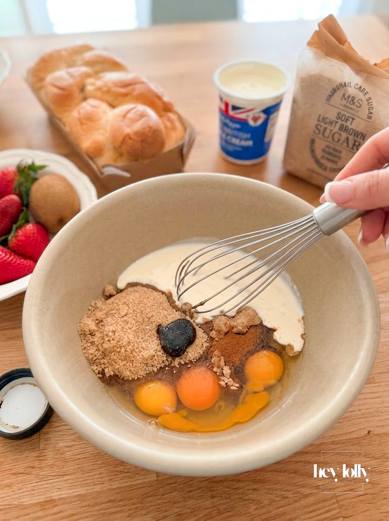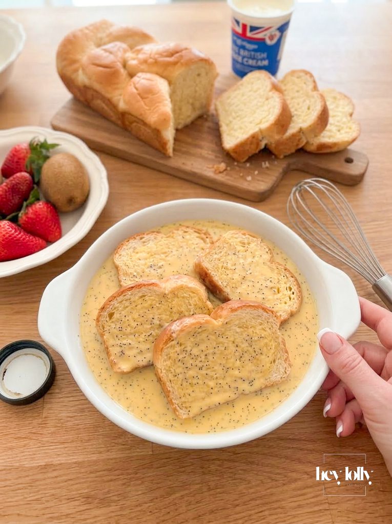 Notes • Slightly stale brioche works best as it absorbs more custard without falling apart.• Swap the fruit depending on the season — stewed cinnamon apples or pears work beautifully in colder months.• A splash of orange zest in the custard adds a lovely brightness.