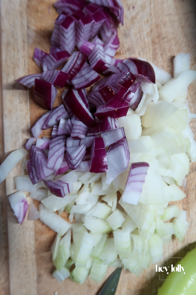 - Add the chopped onions with a pinch of salt and cook for 8–10 minutes, stirring often, until soft and lightly golden. Add ginger, garlic & peppers