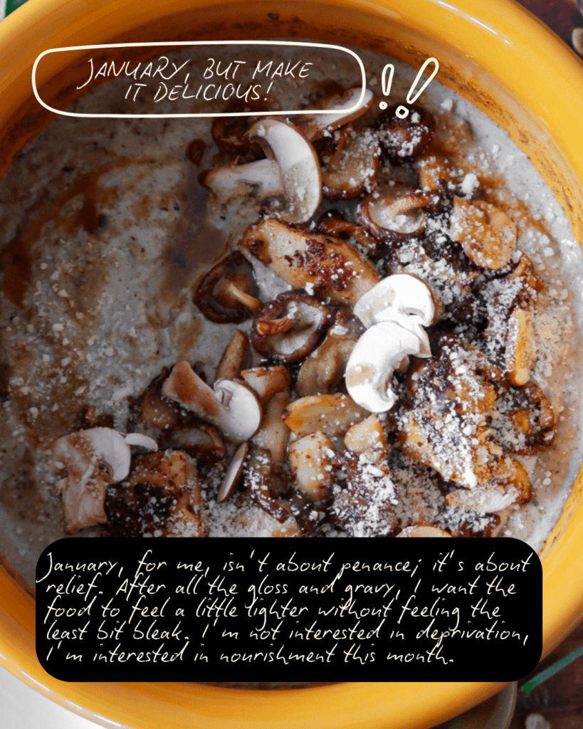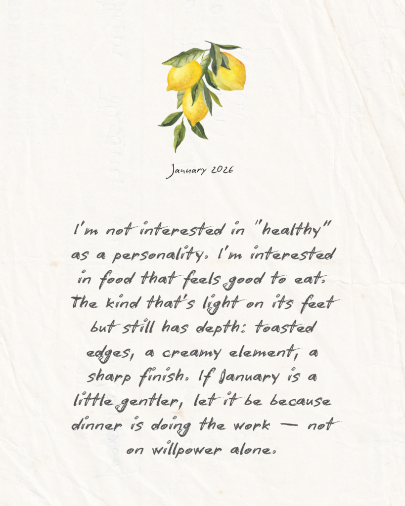 January, for me, isn’t about penance; it’s about relief. After all the gloss and gravy, I want the food to feel a little lighter without feeling the least bit bleak. I’m not interested in deprivation, I’m interested in nourishment, bright vegetables, sharp fruit, and the sort of cooking that tastes like you’ve done something kind for yourself.