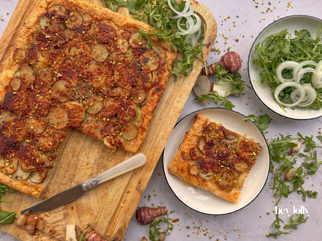 by heylollyA gently golden Jerusalem artichoke and leek tart with soft leeks, truffle pesto and crisp pastry. Perfect as a make-ahead Christmas starter or cosy winter lunch. - Smoked Salmon Puff Pastry Tart with Horseradish Cream & Black Sesame Crust