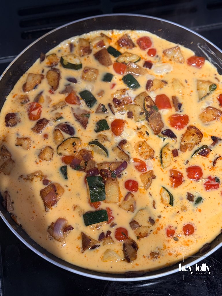 Not enough to make it heavy, just enough to soften the set. You don’t need to measure it precisely, but once you’ve done it a couple of times, you’ll feel when it’s right. The eggs loosen slightly, the texture becomes softer, and the whole thing sets without turning firm or dry.