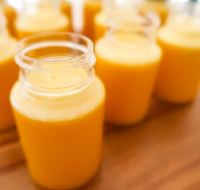 A bright, gently fiery batch of turmeric, ginger and lime shots softened with pineapple and honey. Designed to be drinkable, not punishing — perfect for lunchboxes or a pre-gym zing.