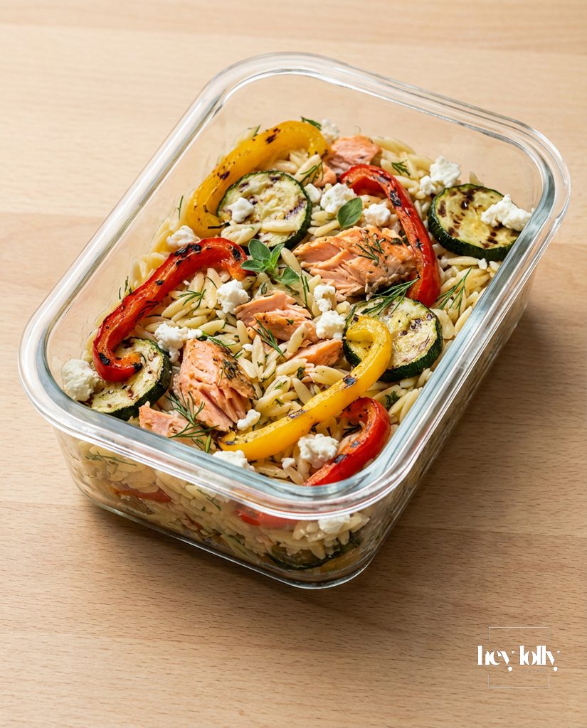 It holds its shape overnight. The orzo doesn’t stiffen. The vegetables stay sweet. The salmon keeps its integrity. It never announces itself as leftovers.