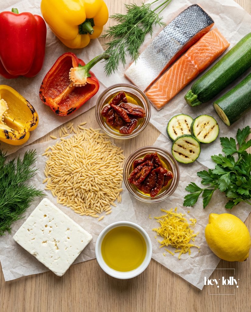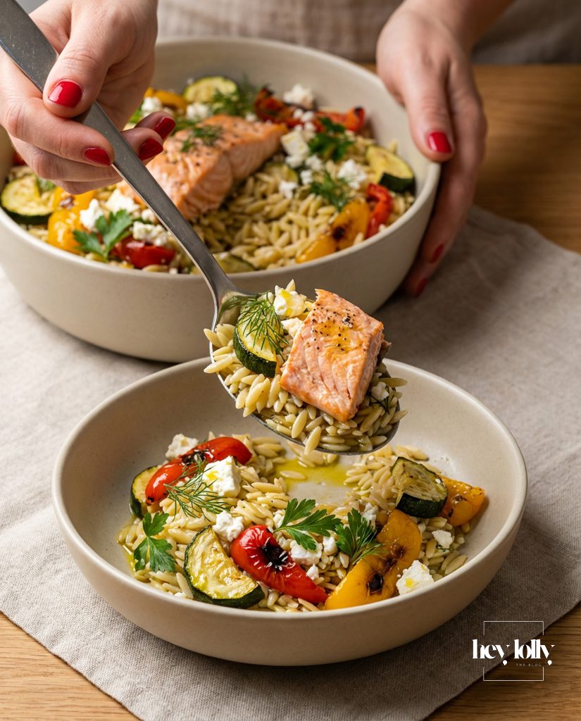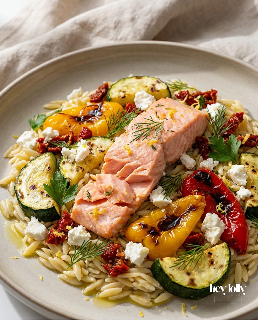 Hey Lolly Kitchen Notes: This salad works beautifully warm, at room temperature or cold. Keep the salmon separate if prepping ahead for lunches. Sun-dried tomatoes add enough richness — no extra salt usually needed. A spoon of Greek yoghurt or labneh folded through the orzo adds creaminess. Dill pairs particularly well with salmon, but parsley alone also works.