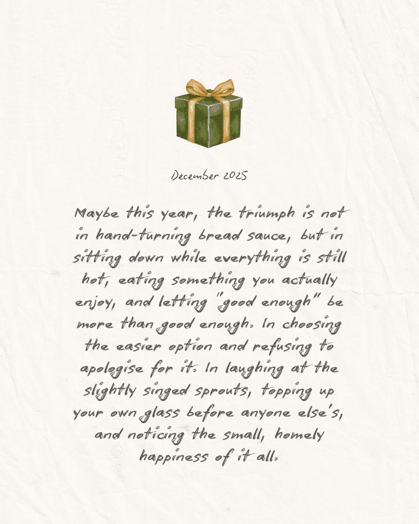 So, this is the promise I am making to myself. This year, a Stress Free Christmas Dinner means choosing ease wherever I reasonably can. It means accepting help, saying yes to frozen peas, and refusing to apologise for gravy granules. It means sitting down, plate full, glass topped up, and letting “good enough” be gloriously and generously enough.