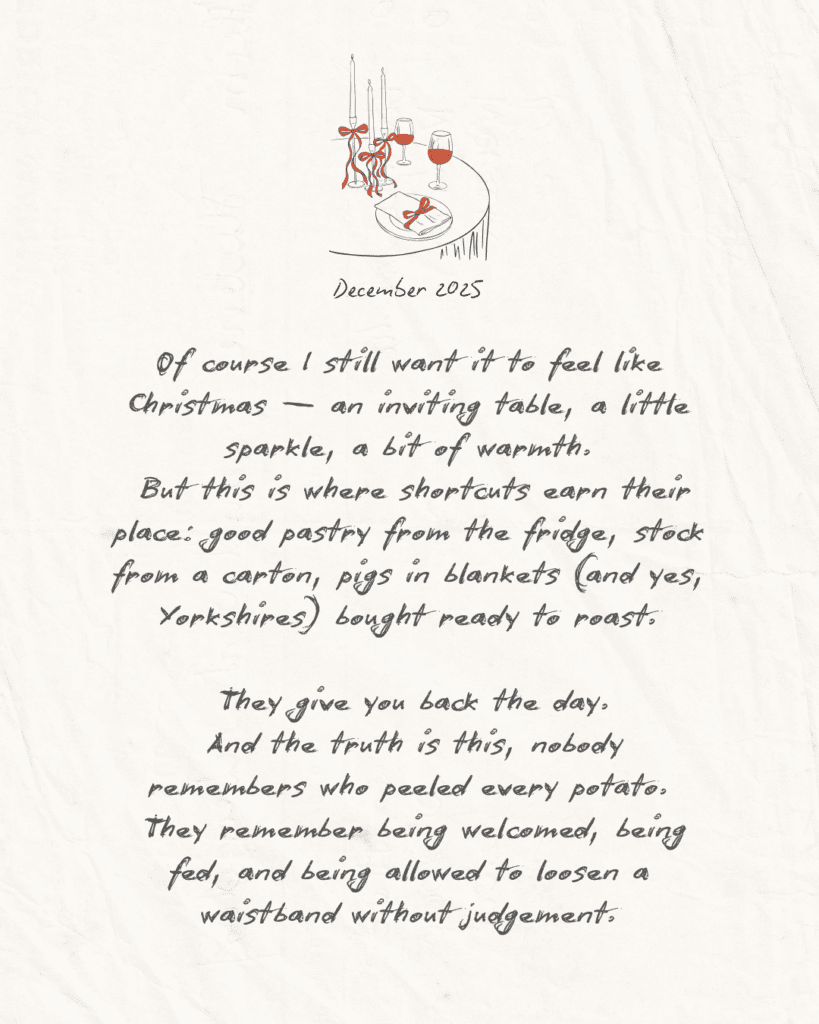 This is where the shortcuts become allies rather than cheats. A good pastry from the fridge. Stock from a carton. Pigs in blankets with yorkshires bought in a bag They let me focus on the parts I actually enjoy, instead of punishing myself with a purist’s list.