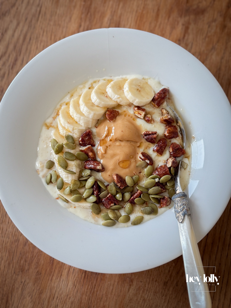 Simple porridge (serves 1): Cook 50g oats in 250ml milk for 3–4 minutes. Off the heat, stir in 1 heaped tablespoon of banana-maple peanut butter. Top with half a sliced banana, 1 tbsp pumpkin seeds, 1 tbsp chopped pecans, and a drizzle of maple syrup. (Life changing… honestly.)