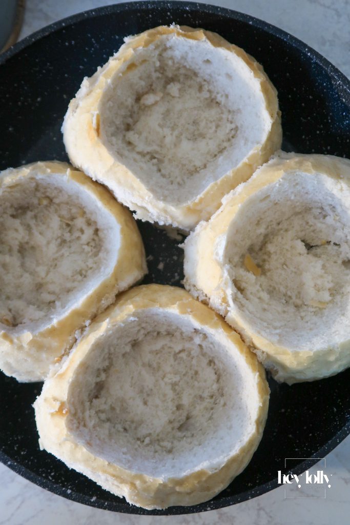 - Slice the tops off the tiger rolls and gently hollow out the centres, leaving sturdy sides and a base.