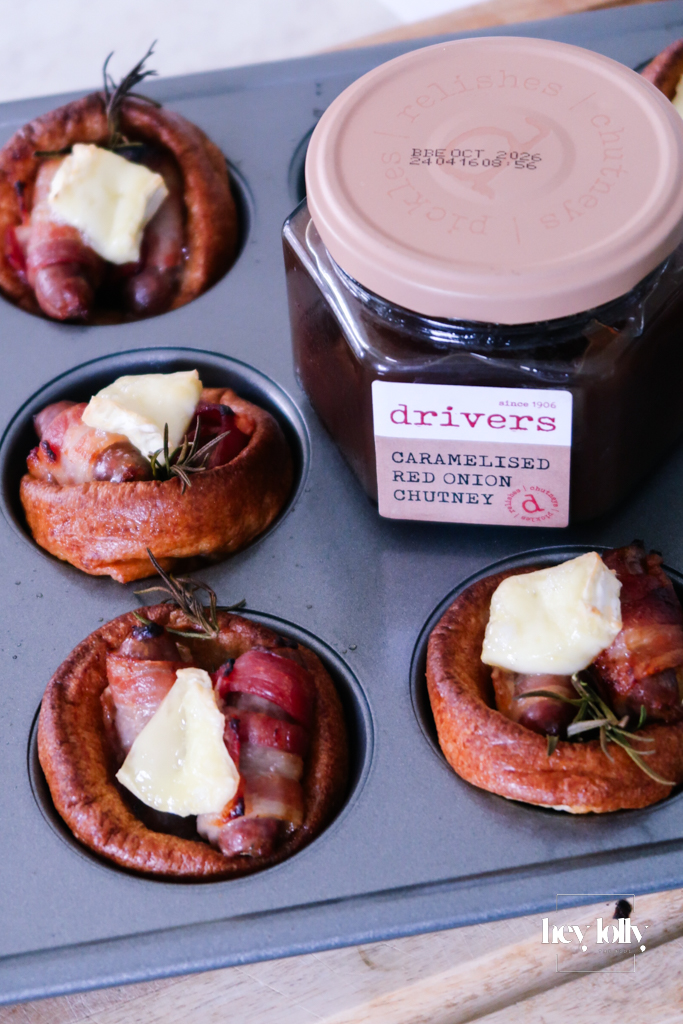 - Spoon a little caramelised onion into each Yorkshire with a slice of brie. Nestle in a pig in blanket. Top with more Brie. Return to the oven 3–4 minutes until the Brie just softens. Finish and Serve