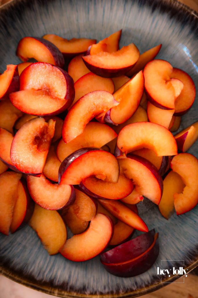 • Arrange the sliced plums on top.