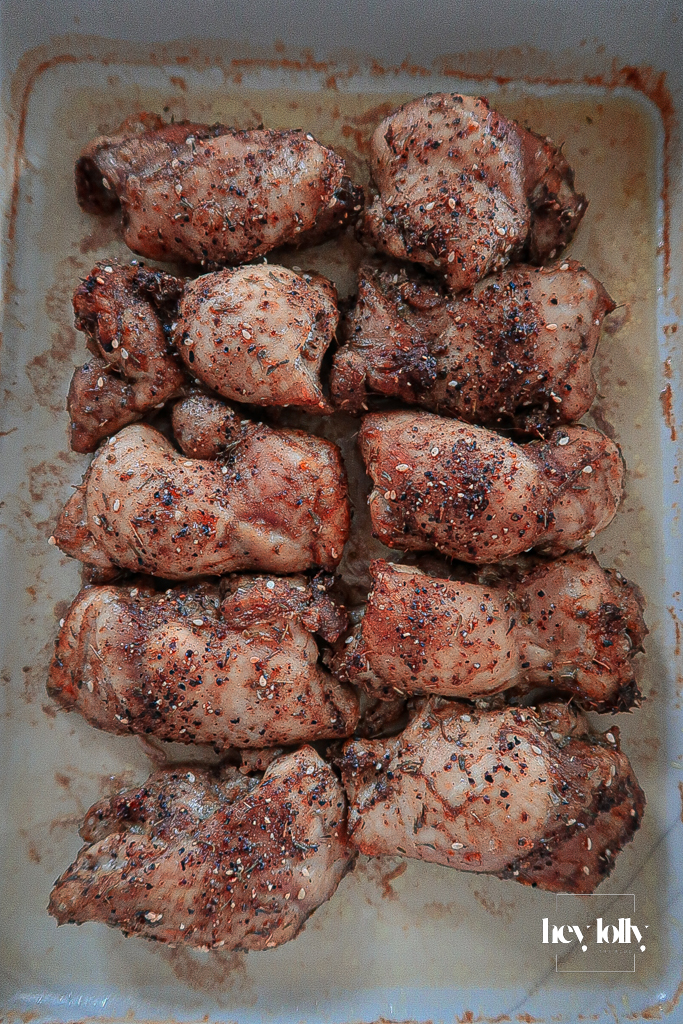 - In a bowl, toss chicken thighs with olive oil, za’atar, cumin, salt, and pepper. Leave at room temperature while the oven heats. Roast the chicken